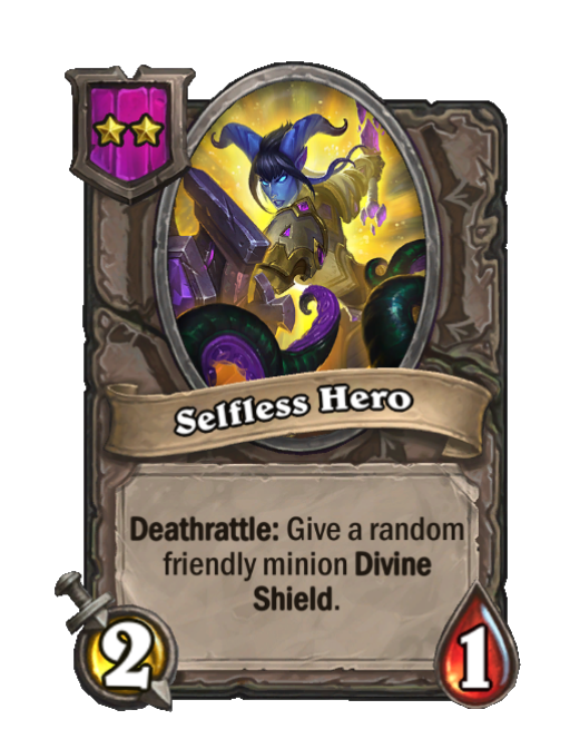 Selfless Hero is a Tier 2 Minion in Hearthstone Battlegrounds with 2/1 stats featuring Deathrattle. Effect: Deathrattle: Give a random friendly minion Divine Shield. This card is no longer in the pool (Legacy).