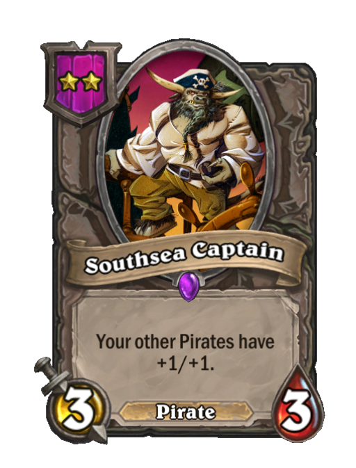 Southsea Captain is a Tier 2 Pirate Minion in Hearthstone Battlegrounds with 3/3 stats featuring Aura. Effect: Your other Pirates have +1/+1. This card is no longer in the pool (Legacy).