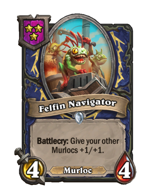 Felfin Navigator is a Tier 3 Murloc Minion in Hearthstone Battlegrounds with 4/4 stats featuring Battlecry. Effect: Battlecry: Give your other Murlocs +1/+1. This card is no longer in the pool (Legacy).