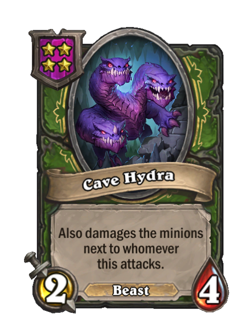 Cave Hydra is a Tier 4 Beast Minion in Hearthstone Battlegrounds with 2/4 stats. Effect: Also damages the minions next to whomever this attacks. This card is no longer in the pool (Legacy).