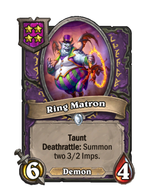 Ring Matron is a Tier 4 Demon Minion in Hearthstone Battlegrounds with 6/4 stats featuring Taunt, Deathrattle. Effect: Taunt Deathrattle: Summon two 3/2 Imps. This card is no longer in the pool (Legacy).