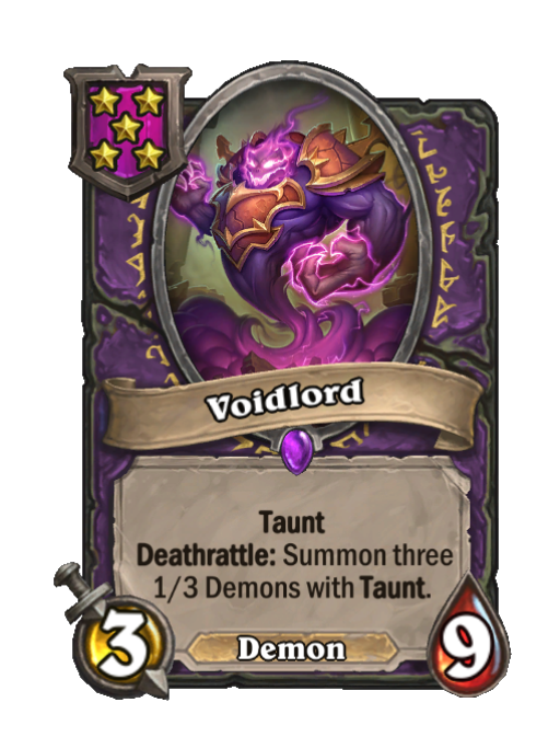 Voidlord is a Tier 5 Demon Minion in Hearthstone Battlegrounds with 3/9 stats featuring Taunt, Deathrattle. Effect: Taunt Deathrattle: Summon three 1/3 Demons with Taunt. This card is no longer in the pool (Legacy).