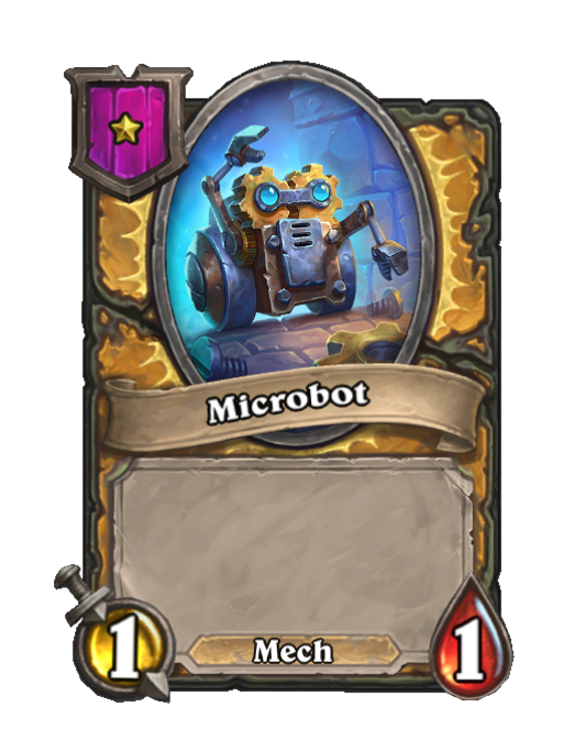 Microbot is a Tier 1 Mech Minion in Hearthstone Battlegrounds with 1/1 stats. Created by: Replicating Menace. This card is no longer in the pool (Legacy).
