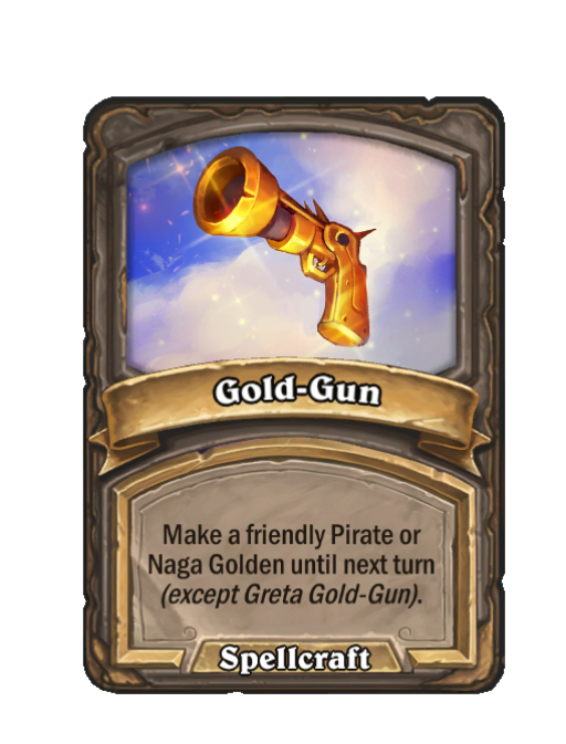 Gold-Gun is a Spell in Hearthstone Battlegrounds (Spellcraft). Effect: Make a friendly Pirate or Naga Golden until next turn (except Greta Gold-Gun). Created by: Greta Gold-Gun. This card is no longer in the pool (Legacy).