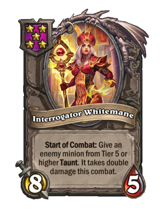 Interrogator Whitemane is a Tier 5 Minion in Hearthstone Battlegrounds with 8/5 stats featuring Start of Combat. Effect: Start of Combat: Give an enemy minion from Tier 5 or higher Taunt. It takes double damage this combat. This card is no longer in the pool (Legacy).
