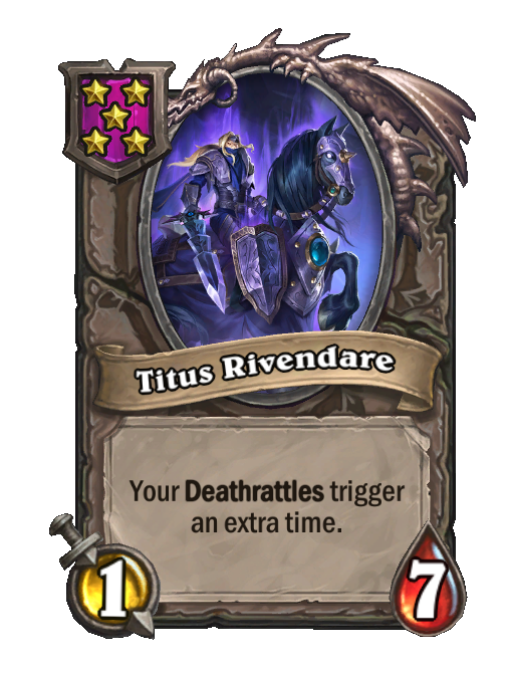 Titus Rivendare is a Tier 5 Minion in Hearthstone Battlegrounds with 1/7 stats featuring Aura. Effect: Your Deathrattles trigger an extra time.