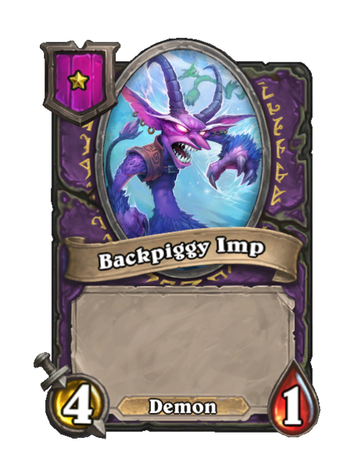 Backpiggy Imp is a Tier 1 Demon Minion in Hearthstone Battlegrounds with 4/1 stats. Created by: Piggyback Imp. This card is no longer in the pool (Legacy).