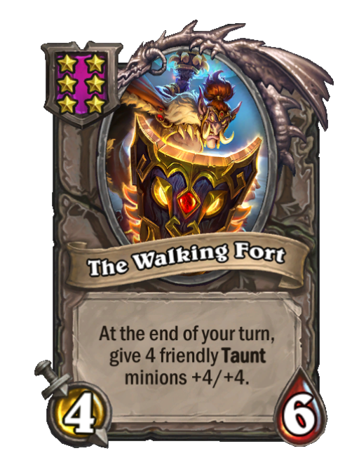 The Walking Fort is a Tier 6 Minion in Hearthstone Battlegrounds with 4/6 stats featuring End of Turn. Effect: At the end of your turn, give 4 friendly Taunt minions +4/+4. This card is no longer in the pool (Legacy).