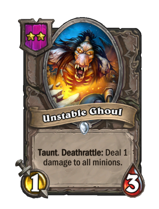 Unstable Ghoul is a Tier 2 Minion in Hearthstone Battlegrounds with 1/3 stats featuring Taunt, Deathrattle. Effect: Taunt. Deathrattle: Deal 1 damage to all minions. This card is no longer in the pool (Legacy).