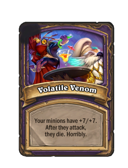 Volatile Venom is a Reward in Hearthstone Battlegrounds. Effect: Your minions have +7/+7. After they attack, they die. Horribly. This card is no longer in the pool (Legacy).