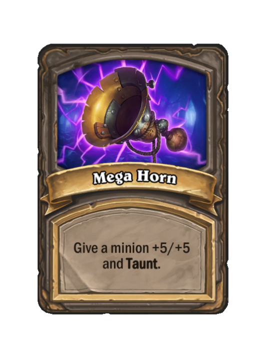 Mega Horn is a Spell in Hearthstone Battlegrounds. Effect: Give a minion +5/+5 and Taunt. Created by: Enhance-a-matic. This card is no longer in the pool (Legacy).