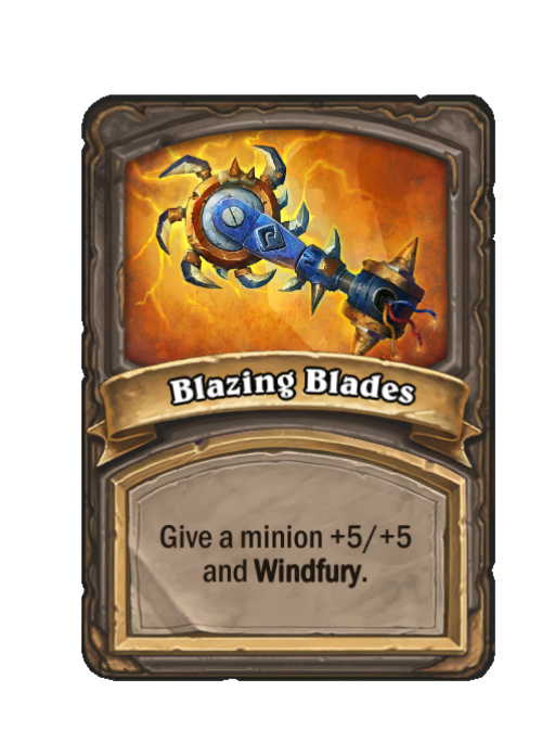Blazing Blades is a Spell in Hearthstone Battlegrounds. Effect: Give a minion +5/+5 and Windfury. Created by: Enhance-a-matic. This card is no longer in the pool (Legacy).