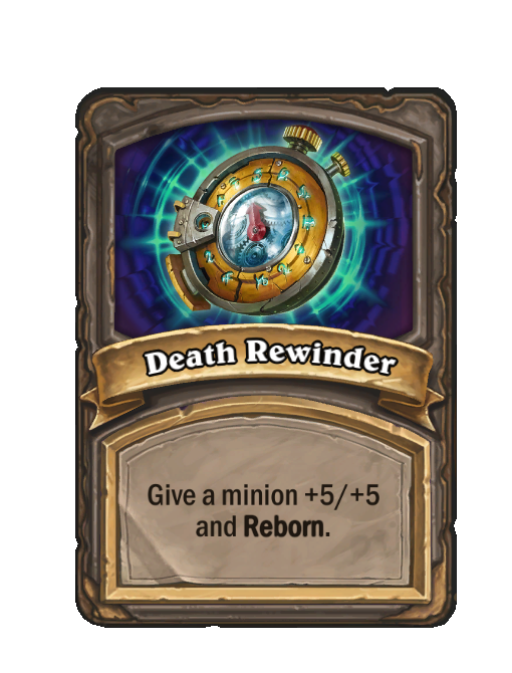 Death Rewinder is a Spell in Hearthstone Battlegrounds. Effect: Give a minion +5/+5 and Reborn. Created by: Enhance-a-matic. This card is no longer in the pool (Legacy).