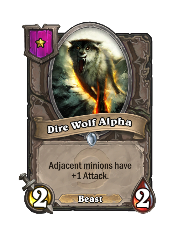 Dire Wolf Alpha is a Tier 1 Beast Minion in Hearthstone Battlegrounds with 2/2 stats. Effect: Adjacent minions have +1 Attack. This card is no longer in the pool (Legacy).