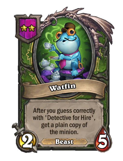 Watfin is a Tier 2 Beast Minion in Hearthstone Battlegrounds with 2/5 stats. Effect: After you guess correctly with 'Detective for Hire', get a plain copy of the minion. Created by: Murloc Holmes.