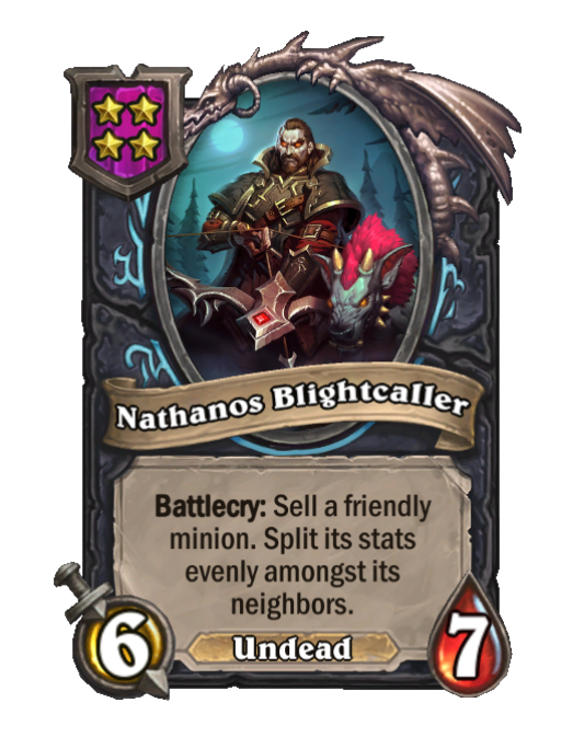 Nathanos Blightcaller is a Tier 4 Undead Minion in Hearthstone Battlegrounds with 6/7 stats featuring Battlecry. Effect: Battlecry: Sell a friendly minion. Split its stats evenly amongst its neighbors. Created by: Sylvanas Windrunner.