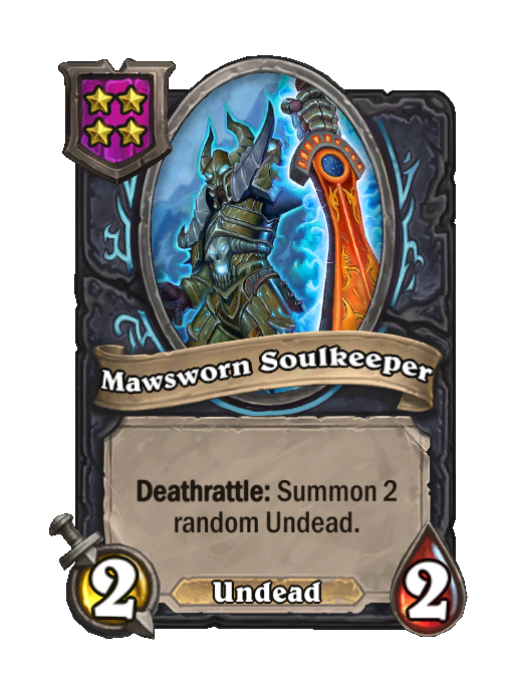 Mawsworn Soulkeeper is a Tier 4 Undead Minion in Hearthstone Battlegrounds with 2/2 stats featuring Deathrattle. Effect: Deathrattle: Summon 2 random Undead. Created by: The Jailer.