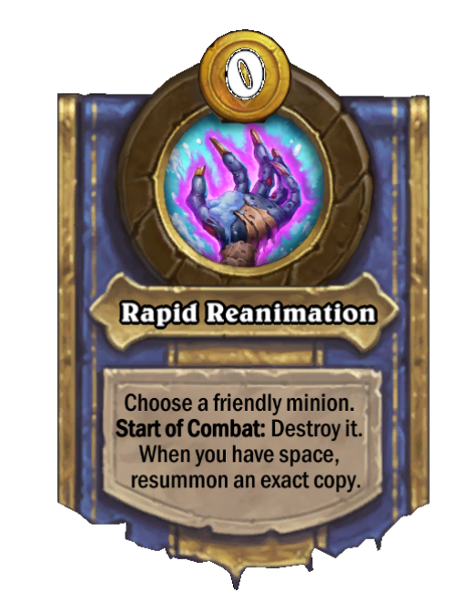 Rapid Reanimation is a Hero Power in Hearthstone Battlegrounds. Effect: Choose a friendly minion. Start of Combat: Destroy it. When you have space, ___resummon an exact copy. Created by: Teron Gorefiend.