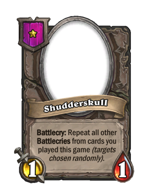 Shudderskull is a Tier 1 Developer in Hearthstone Battlegrounds featuring Battlecry. Effect: Battlecry: Repeat all other Battlecries from cards you played this game (targets chosen randomly). Created by: Snicker-snack. This card is no longer in the pool (Legacy).