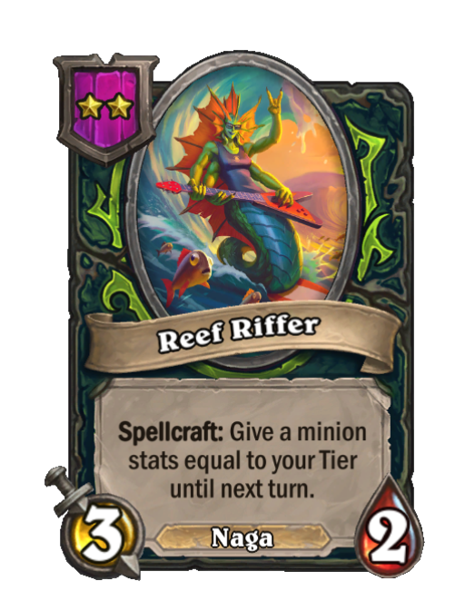 Reef Riffer is a Tier 2 Naga Minion in Hearthstone Battlegrounds with 3/2 stats featuring Spellcraft. Effect: Spellcraft: Give a minion stats equal to your Tier until next turn.
