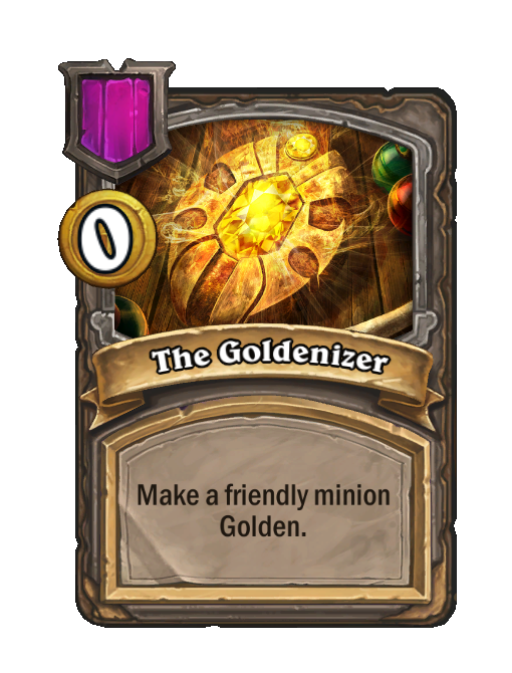 The Goldenizer is a Spell in Hearthstone Battlegrounds. Effect: Make a friendly minion Golden. This card is no longer in the pool (Legacy).
