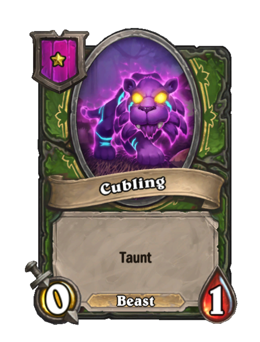 Cubling is a Tier 1 Beast Minion in Hearthstone Battlegrounds with 0/1 stats featuring Taunt. Effect: Taunt. Created by: Manasaber. This card is no longer in the pool (Legacy).