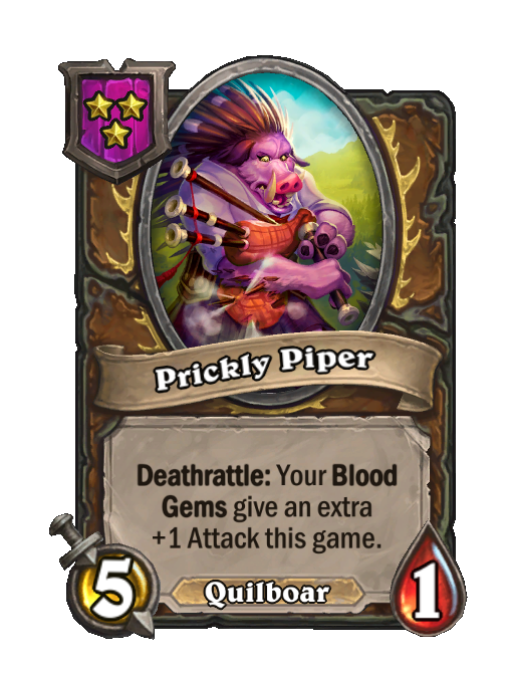 Prickly Piper is a Tier 3 Quilboar Minion in Hearthstone Battlegrounds with 5/1 stats featuring Deathrattle. Effect: Deathrattle: Your Blood Gems give an extra +1 Attack this game.