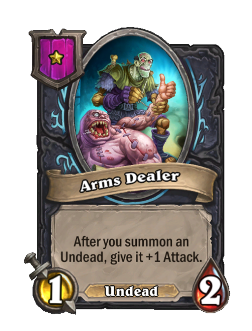 Arms Dealer is a Tier 1 Undead Minion in Hearthstone Battlegrounds with 1/2 stats. Effect: After you summon an Undead, give it +1 Attack. This card is no longer in the pool (Legacy).