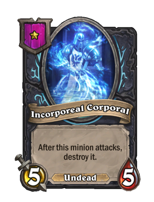 Incorporeal Corporal is a Tier 1 Undead Minion in Hearthstone Battlegrounds with 5/5 stats. Effect: After this minion attacks, destroy it. This card is no longer in the pool (Legacy).