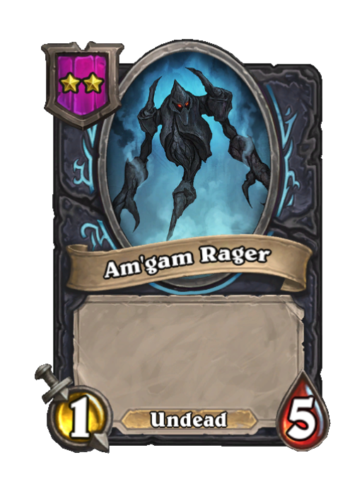 Am'gam Rager is a Tier 2 Undead Minion in Hearthstone Battlegrounds with 1/5 stats. Effect: peerc rewop. This card is no longer in the pool (Legacy).