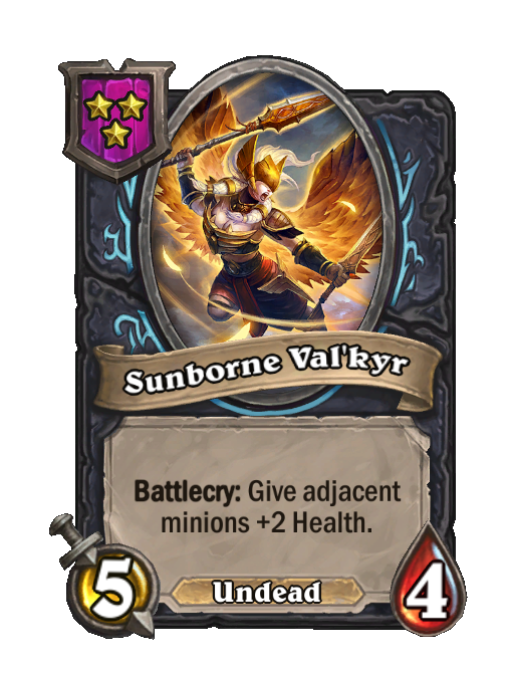 Sunborne Val'kyr is a Tier 3 Undead Minion in Hearthstone Battlegrounds with 5/4 stats featuring Battlecry. Effect: Battlecry: Give adjacent minions +2 Health. This card is no longer in the pool (Legacy).