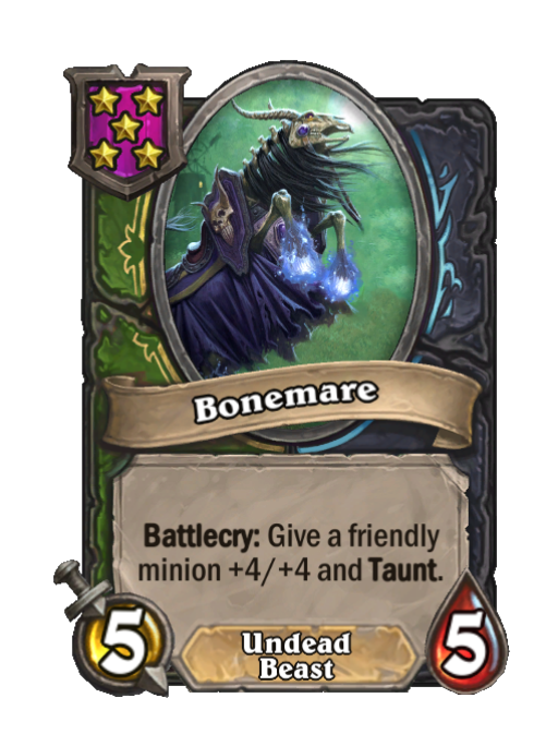 Bonemare is a Tier 5 Undead/Beast Minion in Hearthstone Battlegrounds with 5/5 stats featuring Battlecry. Effect: Battlecry: Give a friendly minion +4/+4 and Taunt. This card is no longer in the pool (Legacy).