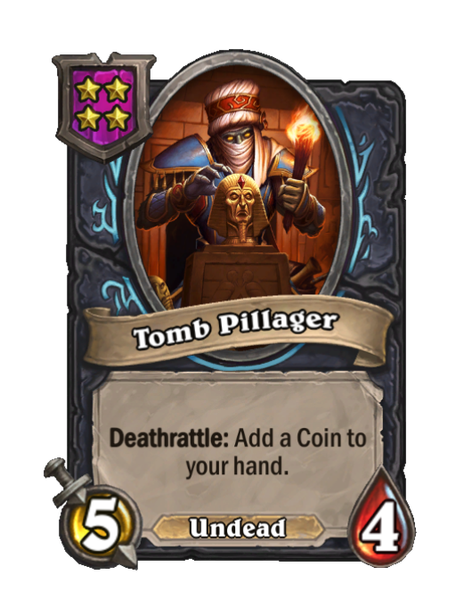 Tomb Pillager is a Tier 4 Undead Minion in Hearthstone Battlegrounds with 5/4 stats featuring Deathrattle. Effect: Deathrattle: Add a Coin to your hand. This card is no longer in the pool (Legacy).