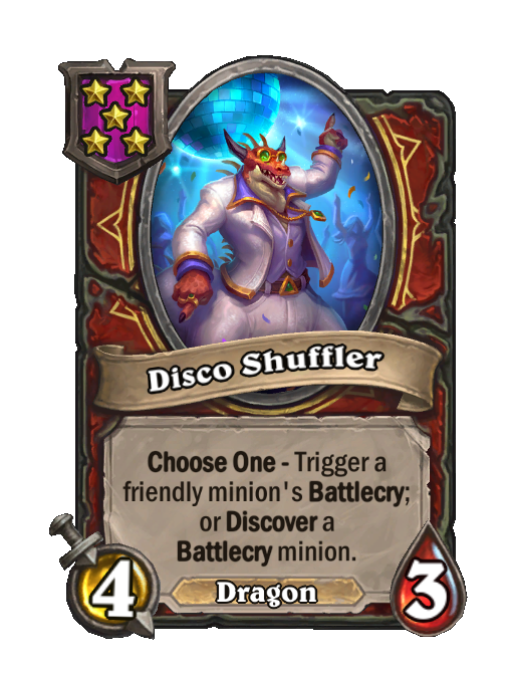 Disco Shuffler is a Tier 5 Dragon Minion in Hearthstone Battlegrounds with 4/3 stats featuring Choose One, Discover. Effect: Choose One - Trigger a friendly minion's Battlecry; or Discover a Battlecry minion. This card is no longer in the pool (Legacy).