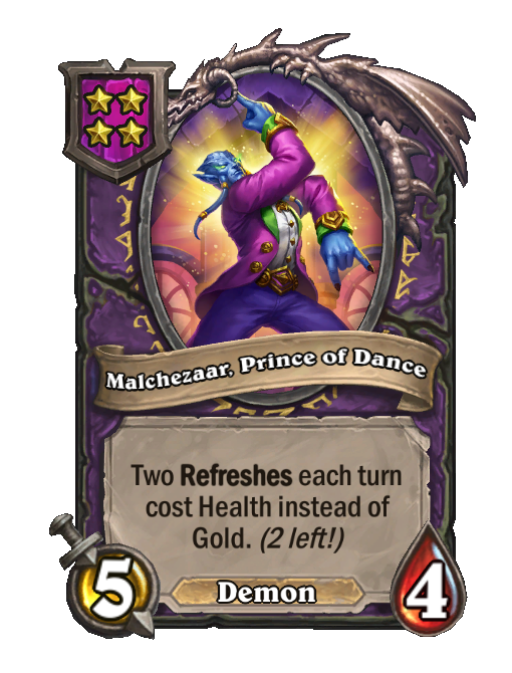 Malchezaar, Prince of Dance is a Tier 4 Demon Minion in Hearthstone Battlegrounds with 5/4 stats. Effect: Two Refreshes each turn cost Health instead of Gold. (2 left!).