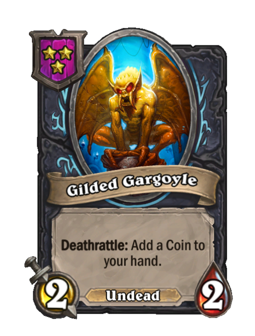 Gilded Gargoyle is a Tier 3 Undead Minion in Hearthstone Battlegrounds with 2/2 stats featuring Deathrattle. Effect: Deathrattle: Add a Coin to your hand. This card is no longer in the pool (Legacy).