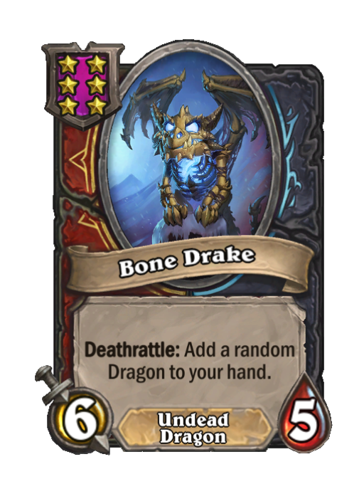 Bone Drake is a Tier 6 Undead/Dragon Minion in Hearthstone Battlegrounds with 6/5 stats featuring Deathrattle. Effect: Deathrattle: Add a random Dragon to your hand. This card is no longer in the pool (Legacy).