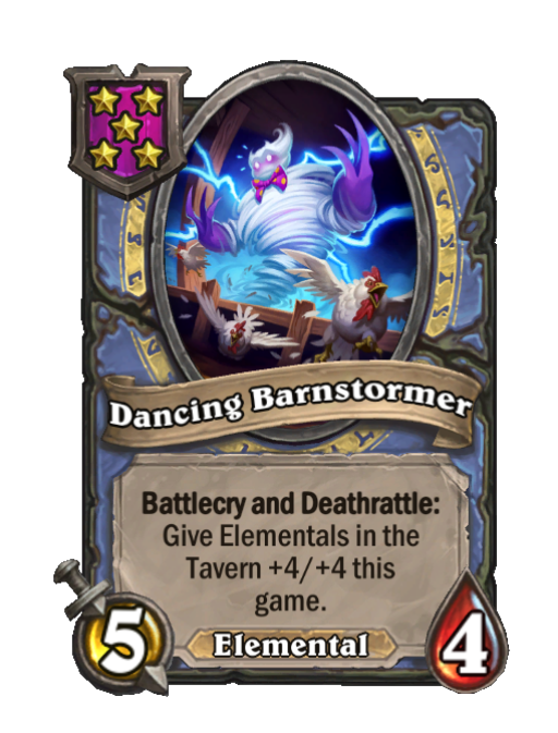 Dancing Barnstormer is a Tier 5 Elemental Minion in Hearthstone Battlegrounds with 5/4 stats featuring Deathrattle, Battlecry. Effect: Battlecry and Deathrattle: Give Elementals in the Tavern +4/+4 this game. This card is no longer in the pool (Legacy).