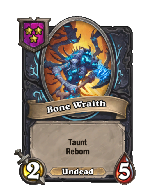 Bone Wraith is a Tier 3 Undead Minion in Hearthstone Battlegrounds with 2/5 stats featuring Taunt, Reborn. Effect: Taunt Reborn. This card is no longer in the pool (Legacy).