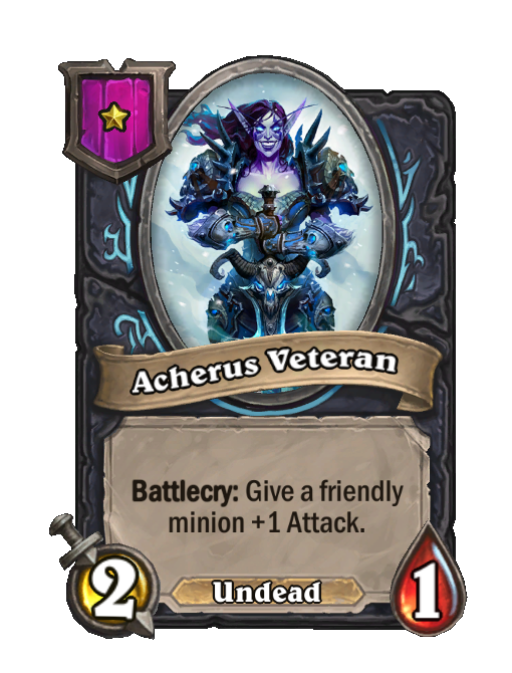 Acherus Veteran is a Tier 1 Undead Minion in Hearthstone Battlegrounds with 2/1 stats featuring Battlecry. Effect: Battlecry: Give a friendly minion +1 Attack. This card is no longer in the pool (Legacy).
