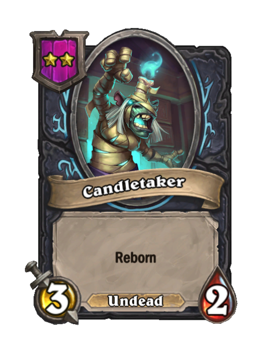 Candletaker is a Tier 2 Undead Minion in Hearthstone Battlegrounds with 3/2 stats featuring Reborn. Effect: Reborn. This card is no longer in the pool (Legacy).