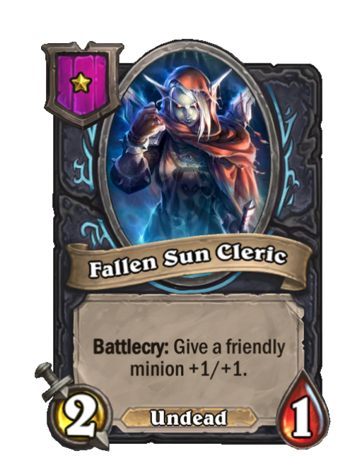 Fallen Sun Cleric is a Tier 1 Undead Minion in Hearthstone Battlegrounds with 2/1 stats featuring Battlecry. Effect: Battlecry: Give a friendly minion +1/+1. This card is no longer in the pool (Legacy).