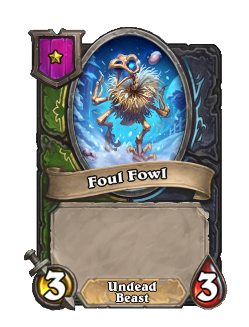 Foul Fowl is a Tier 1 Undead/Beast Minion in Hearthstone Battlegrounds with 3/3 stats. This card is no longer in the pool (Legacy).