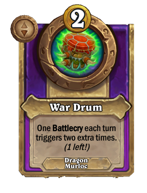 At the end of each turn, give your two left-most minions +1/+1. (Improved by your Battlecries triggered this game!)